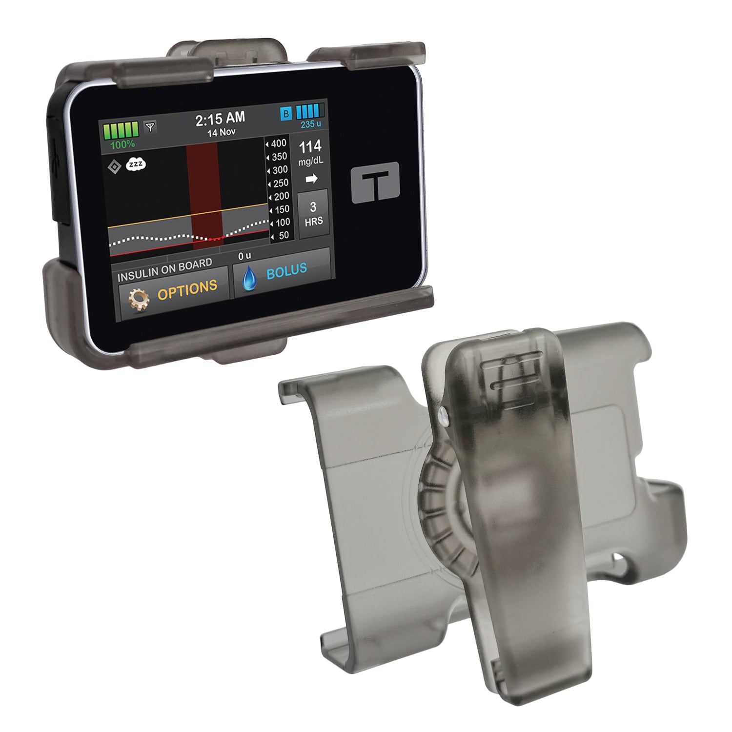 Compatible with Tandem t:slim, t:slim X2, and t:slim G4 insulin pumps. (Not compatible with t:flex or Medtronic models.) Available in Gray, Orange, Pink, and Yellow.