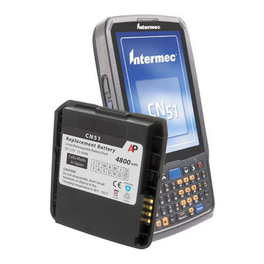 Intermec CN51 Replacement Battery. Fully replaces battery number 1015AB01. The 4800 mAh capacity rating is 22% higher than the 3920 mAh capacity rating of the 1015AB01 battery. Lithium Ion, 3.7 Volt, 17.76 Wh, Cells made in Japan by Panasonic.
