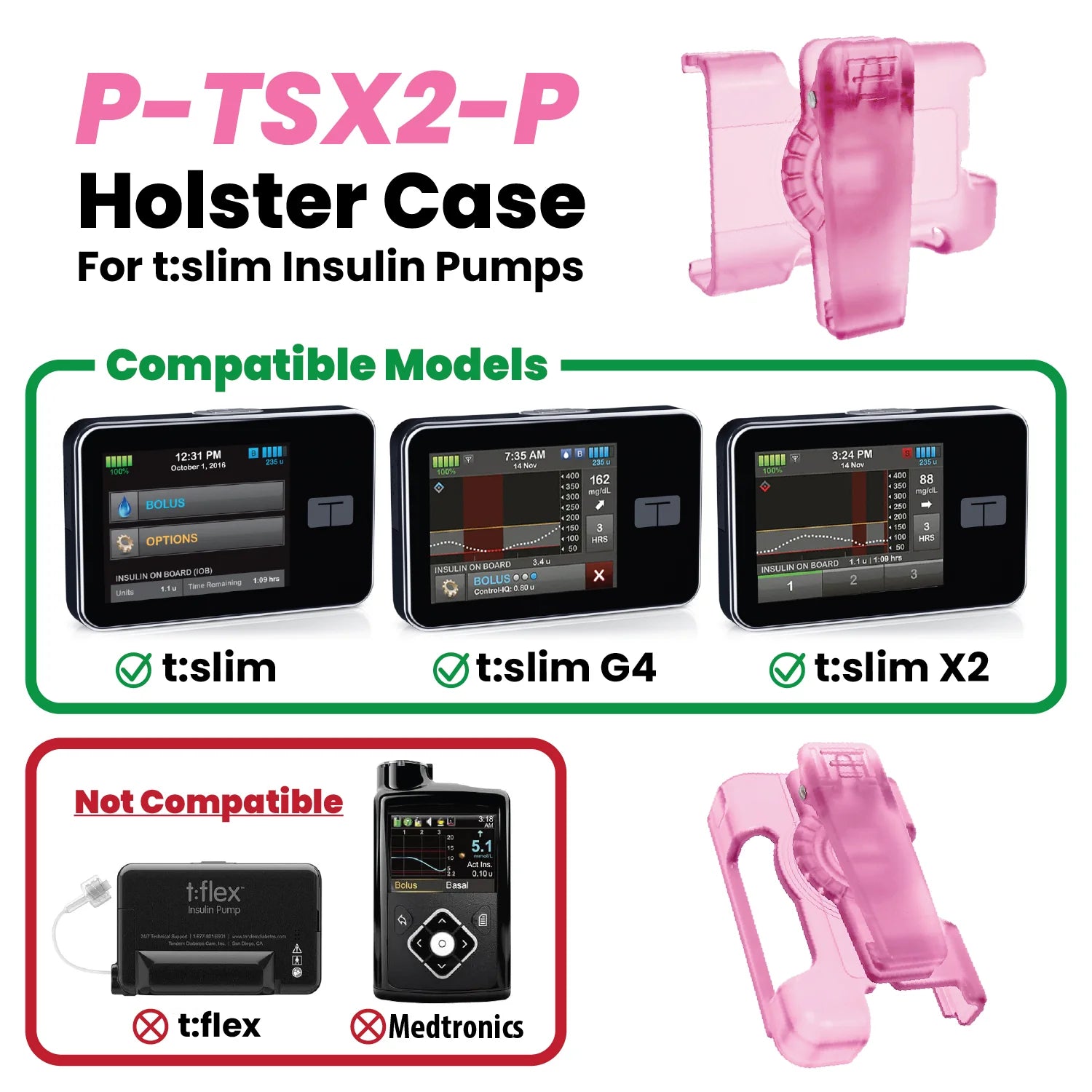 Compatible with Tandem t:slim, t:slim X2, and t:slim G4 insulin pumps. (Not compatible with t:flex or Medtronic models.) Available in Gray, Orange, Pink, and Yellow.