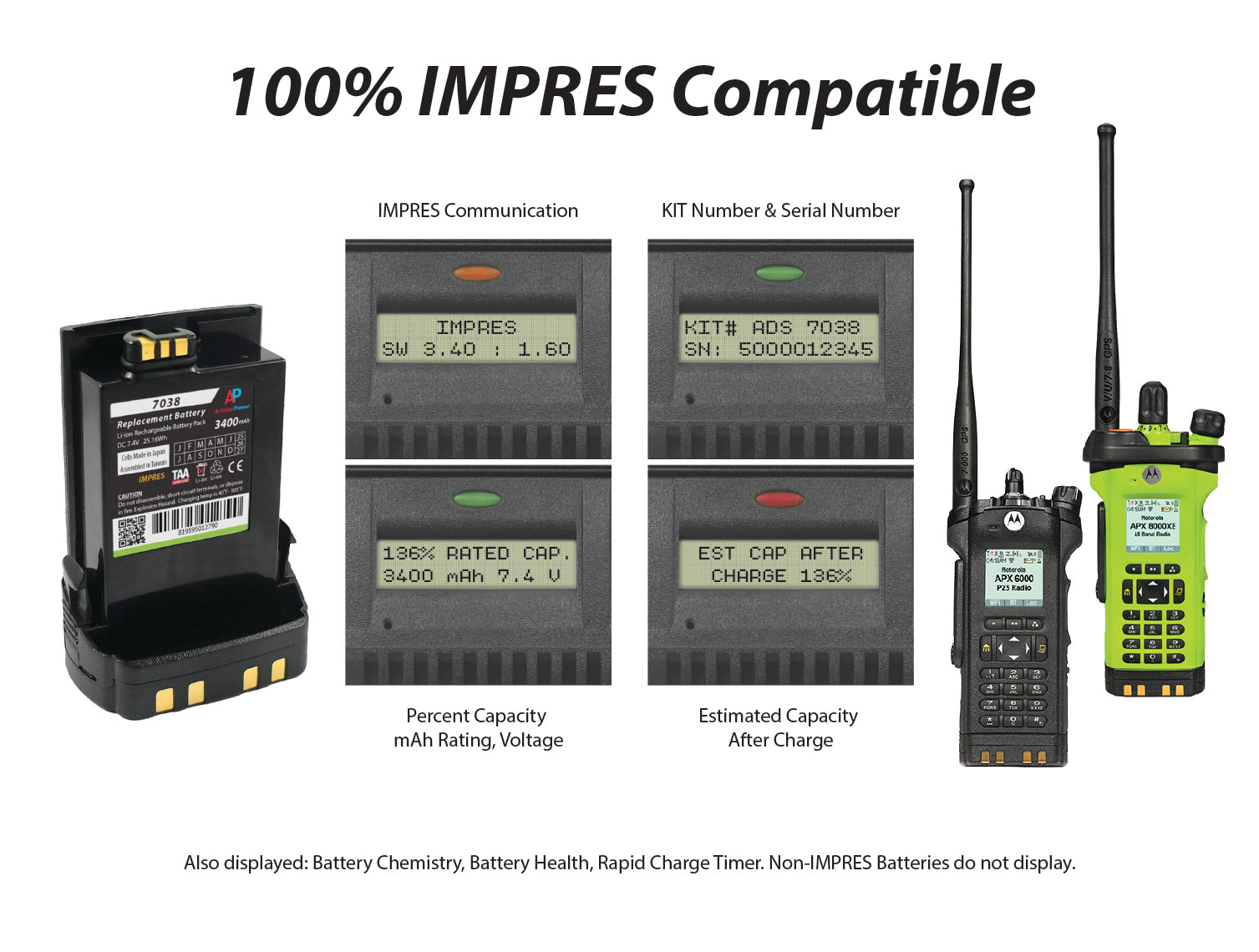 Fully IMPRES compatible, the battery must be initialized in an IMPRES charger before first use to enable smart battery features. Insert the battery until the charger shows a steady yellow indicator, then allow it to charge for up to 12 hours for initial calibration. Once complete, full capacity data and optimized charging performance will be available for mission-critical public safety use.